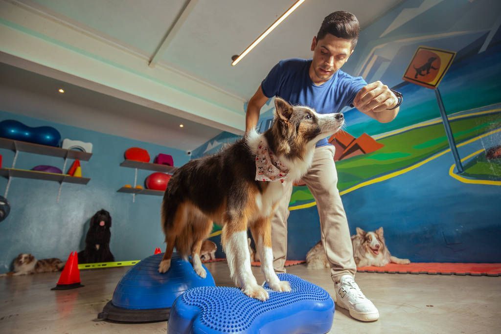 在这里,训练师会让狗狗在跑步机上行走、跳过障碍物、在长凳上行走或在波速球(bosu)上保持平衡,以锻炼它们前爪和后爪的肌肉。训练过后,它们也有玩耍、社交和放松时间,或者在配有沙发、地毯和装饰物的房间里接受行为训练。
