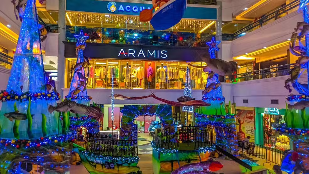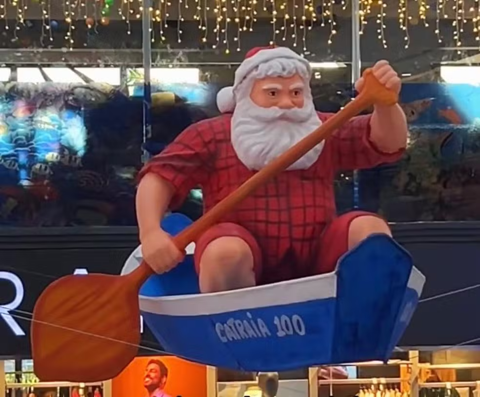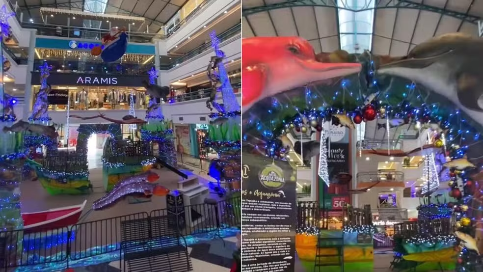 这家购物中心圣诞装饰品的最大亮点是以划船者形象出现的圣诞老人,代表了亚马孙河流域的特有风貌以及在该地区水域划船航行的居民。其他装饰品描绘了水面以下的场景,其中包括亚马孙河特有鱼类、海牛、电鳗、海龟、亚马孙河豚等。当圣诞老人移动至某个位置时,会沿着绳索下降,在有装饰品组成的亚马孙河流中进行“潜水”。