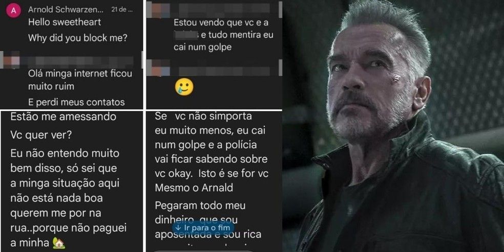 一些公开文件记录了“施瓦辛格”与受害者的交流过程。在其中一张对话截图中,骗子用英语与她交谈,并称她为“亲爱的”。另一张截图显示了她发现自己落入骗局的一刻,“这都是谎言,我被骗了。”她还写道:“我落入了骗局,警察会查出你的情况。我是说,如果那真的是你的话,阿诺德。”