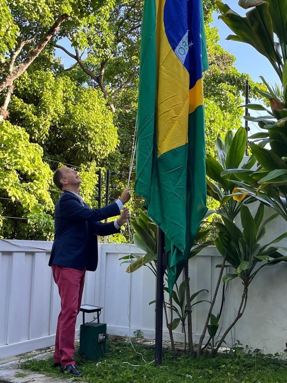 8月1日,阿根廷大使馆的一名工作人员在驻委内瑞拉大使官邸升起巴西国旗。巴西外交部