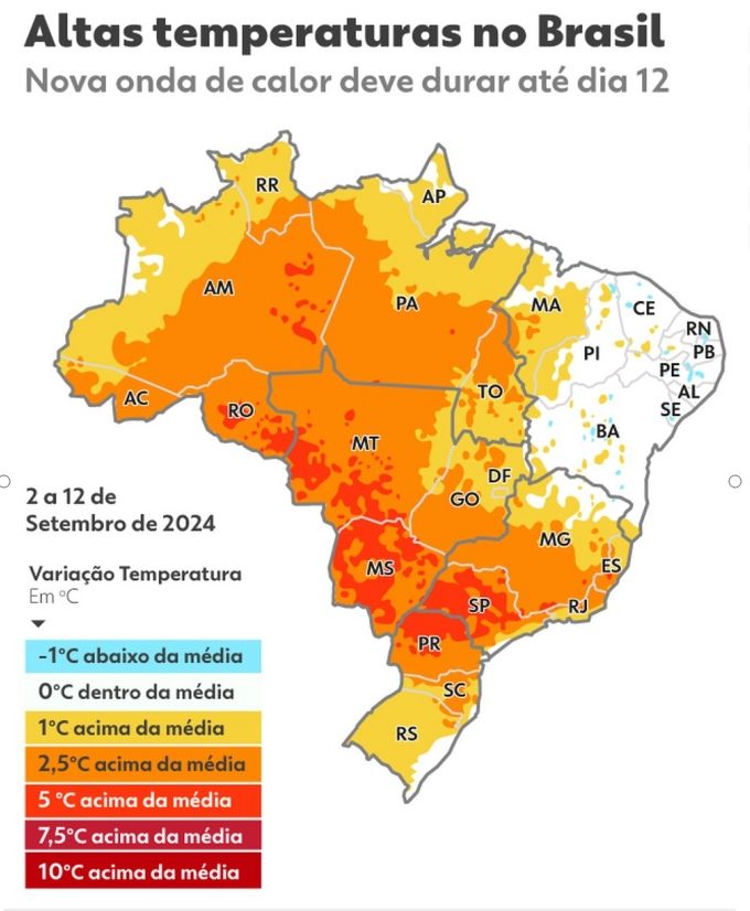 Climatempo的气象学家法比奥·卢恩戈(Fábio Luengo)表示,巴西中西部地区,尤其是马托格罗索州(Mato Grosso)的气温应该会超过40°C。此外,朗多尼亚州(Rondônia)、托坎廷斯州(Tocantins)、戈亚斯州(Goiás)、圣保罗州(São Paulo)等地的气温也可能接近40°C。