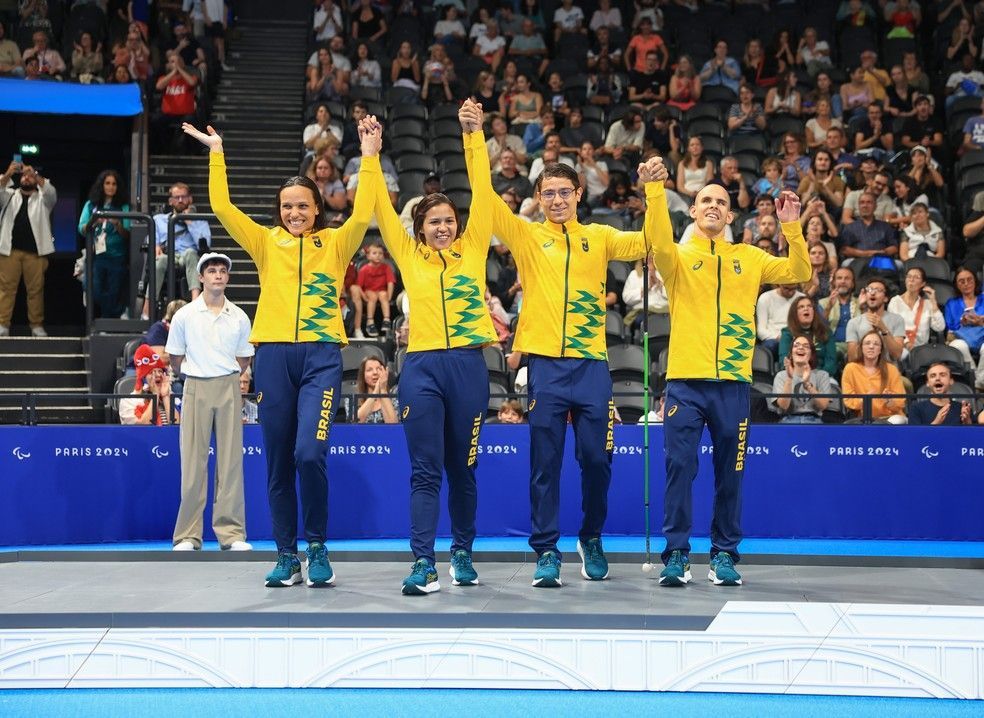 4日,卡罗尔·圣地亚哥(左一)在男女混合接力比赛中赢得了1枚团体银牌。巴西残奥委员会