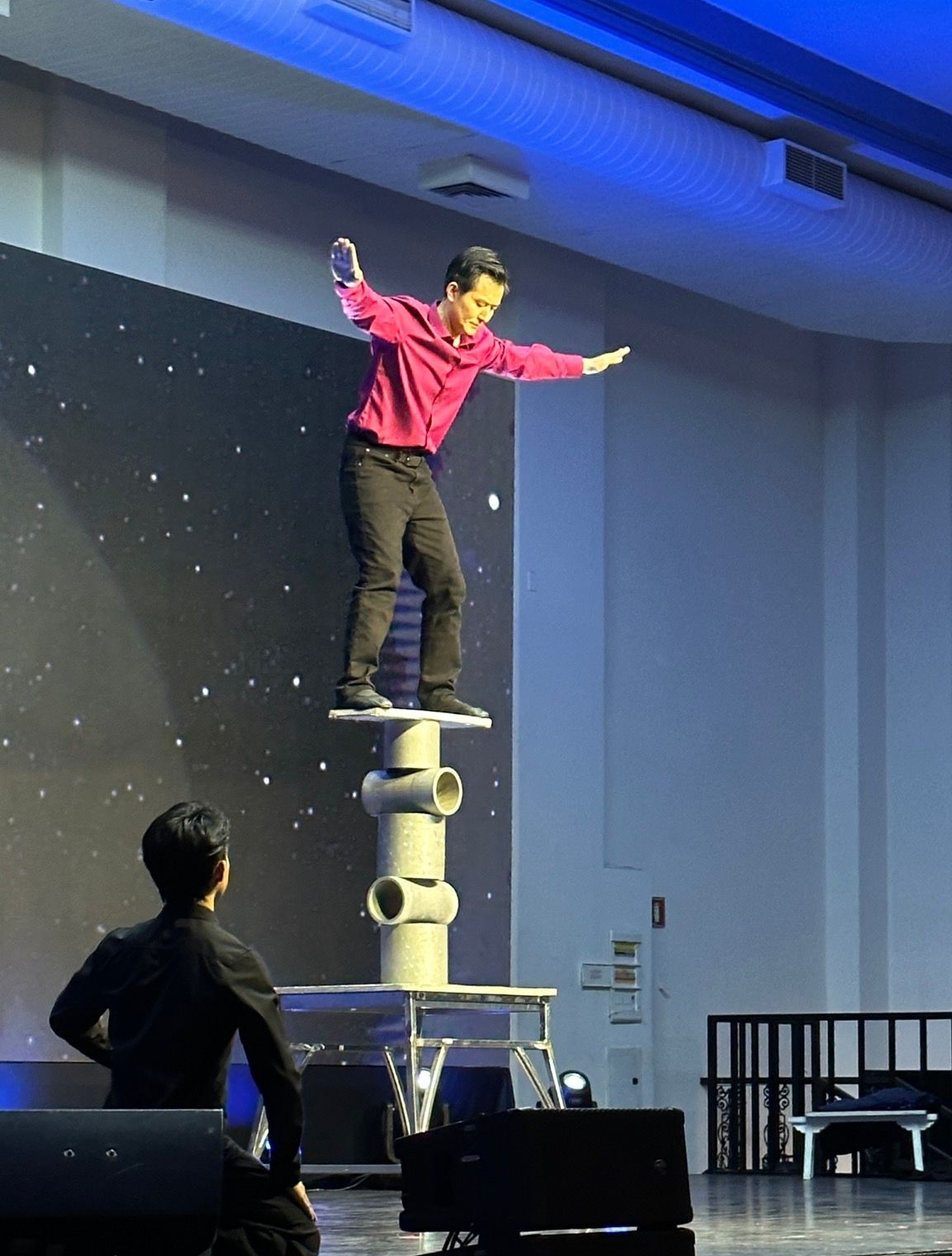 青年歌手赵学飞以独特的流行摇滚与民族唱法融合,接连献唱《陪你一起看草原》《怒放的生命》,他极具感染力的嗓音与舞台互动,引得台下观众掌声、欢呼声不断。紧接着,杂技演员邢立军带来的《炫艺幻影》将球技抛接玩得出神入化,惊险刺激的表演让观众心跳加速,现场惊叹声此起彼伏。