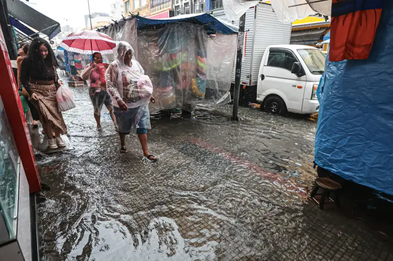圣保罗市中部地区居民在积水的街道上前行。图片来源:巴西国家通讯社