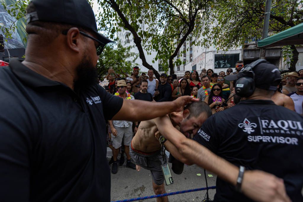 此外,在整场游行活动中,还发生多起冲突事件。一名位于隔离警戒线外的狂欢活动参与者袭击了一名工作人员,后被安保人员制服。而当游行队伍行进至两条大道的交汇处时,还发生了一场大规模斗殴事件。数名在警戒线外的男子互相拳打脚踢,甚至有些人倒地不起,引发了一场混乱。安保人员迅速介入平息事态,一名涉事男子被消防员及安保人员安全带离现场。