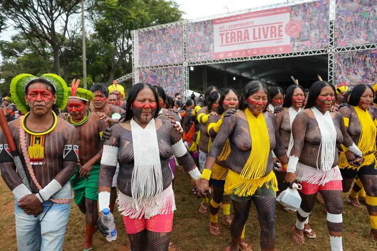 数千名原住民抵达巴西利亚参加自由土地营活动。巴西国家通讯社