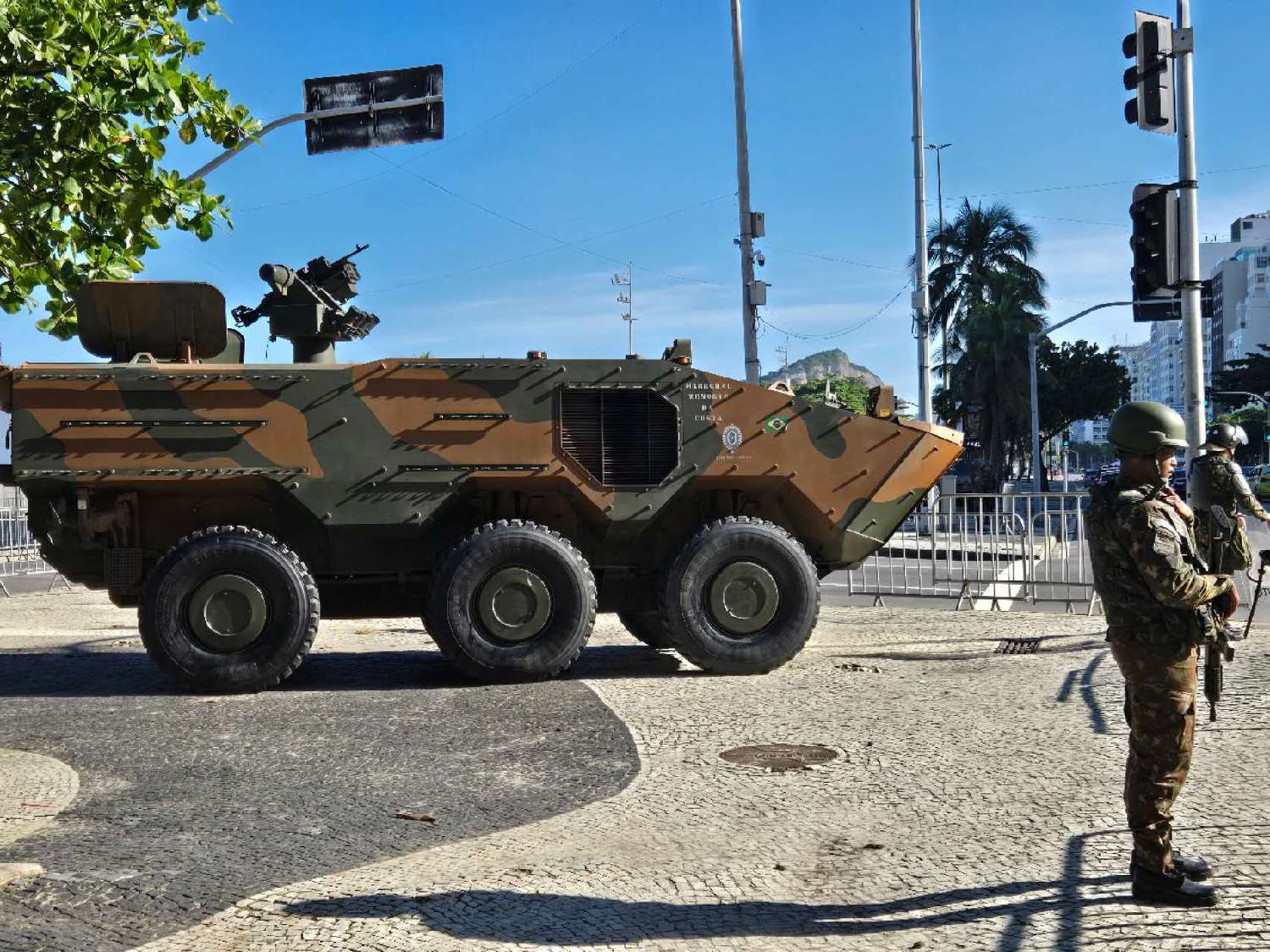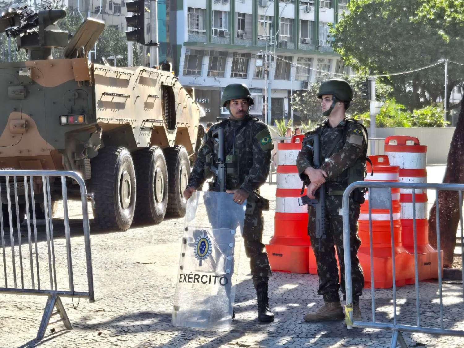 金砖国家领导人第十七次会晤将于7月6日至7日在巴西里约热内卢举行,在主会场里约现代艺术博物馆及市中心的主要街道上,每隔一段距离就可以看到驻守的安防车辆和执勤的军队及保安人员。(柠檬摄)