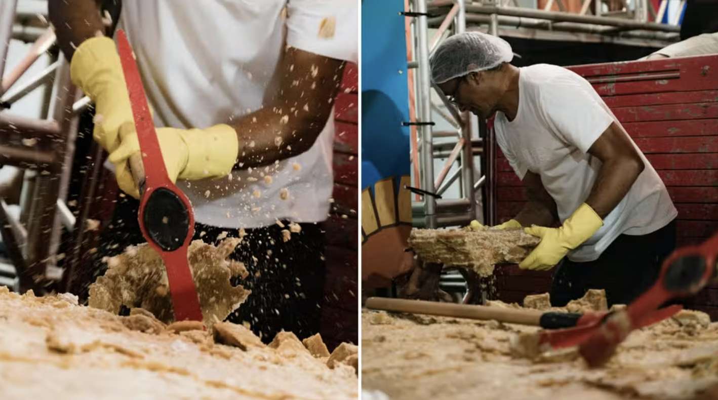 黑糖分发的场面因所需的巨大力气和“工业级工具”在社交媒体上引发热议,这种糖果正如其名,以坚硬耐储存而著称。
