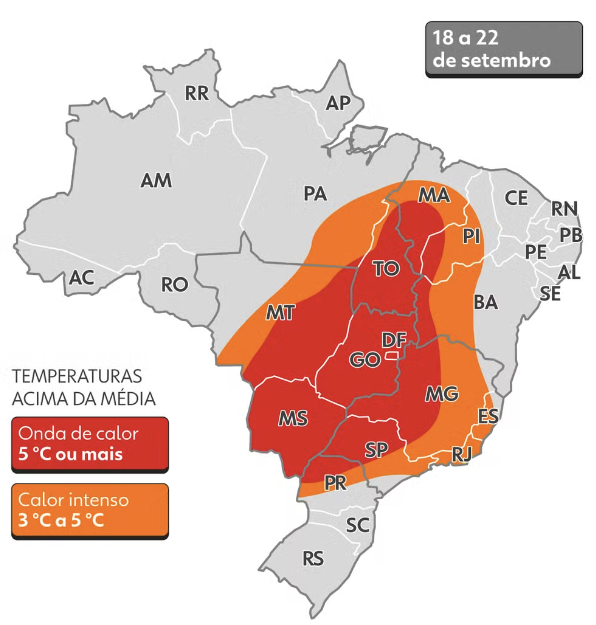 气象学家指出,这轮热浪将导致巴西大范围地区气温比常年9月高出5℃至8℃。中西部和东南内陆的升温最为显著。库亚巴、大平原可能达到40℃,果亚尼亚(Goiânia)和巴西利亚(Brasília)最高气温则在33℃至35℃之间,并伴随空气湿度持续走低,部分时段不足30%。