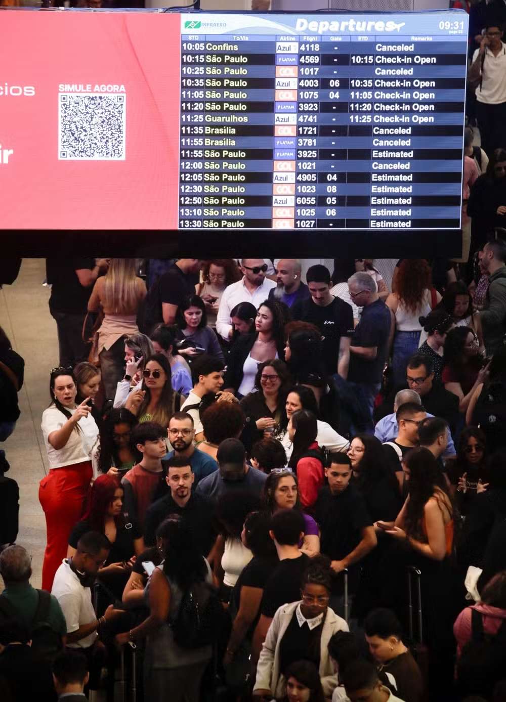机场大厅等待航班的乘客,大屏幕上显示多趟取消的航班。巴西环球网