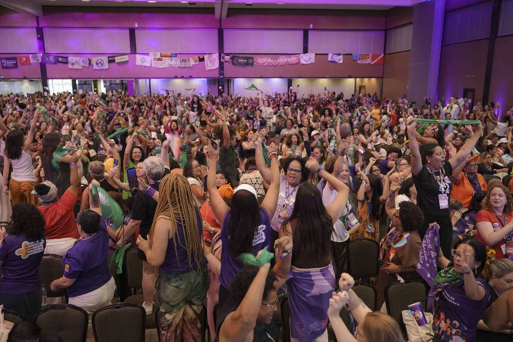 参会代表为堕胎合法化建议获批列入妇女政策计划指导方针而欢呼。《圣保罗页报》