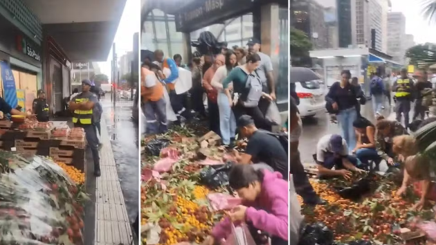 视频中,这名摊贩还鼓励路过保利斯塔大道、从地铁特里亚农—马斯普站(Estação Trianon-Masp)出来的行人捡走水果。“大家可以拿,随便拿,‘rapa’想吃水果。”他说。在他呼吁后,一些路人捡起并带走了地上的水果。