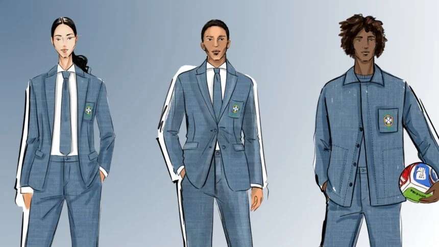 该品牌解释,所有服装均将选用意大利轻薄羊毛面料制作,该面料以轻盈舒适的特色著称。服装颜色选用了低饱和度的灰调蓝绿色(Soft Teal),旨在展现稳重而现代的风格。内衬采用相同配色方案,专为官方定制服装设计,强化整体视觉统一感。另外,每套服装上均带有巴西足协(CBF)的徽章。