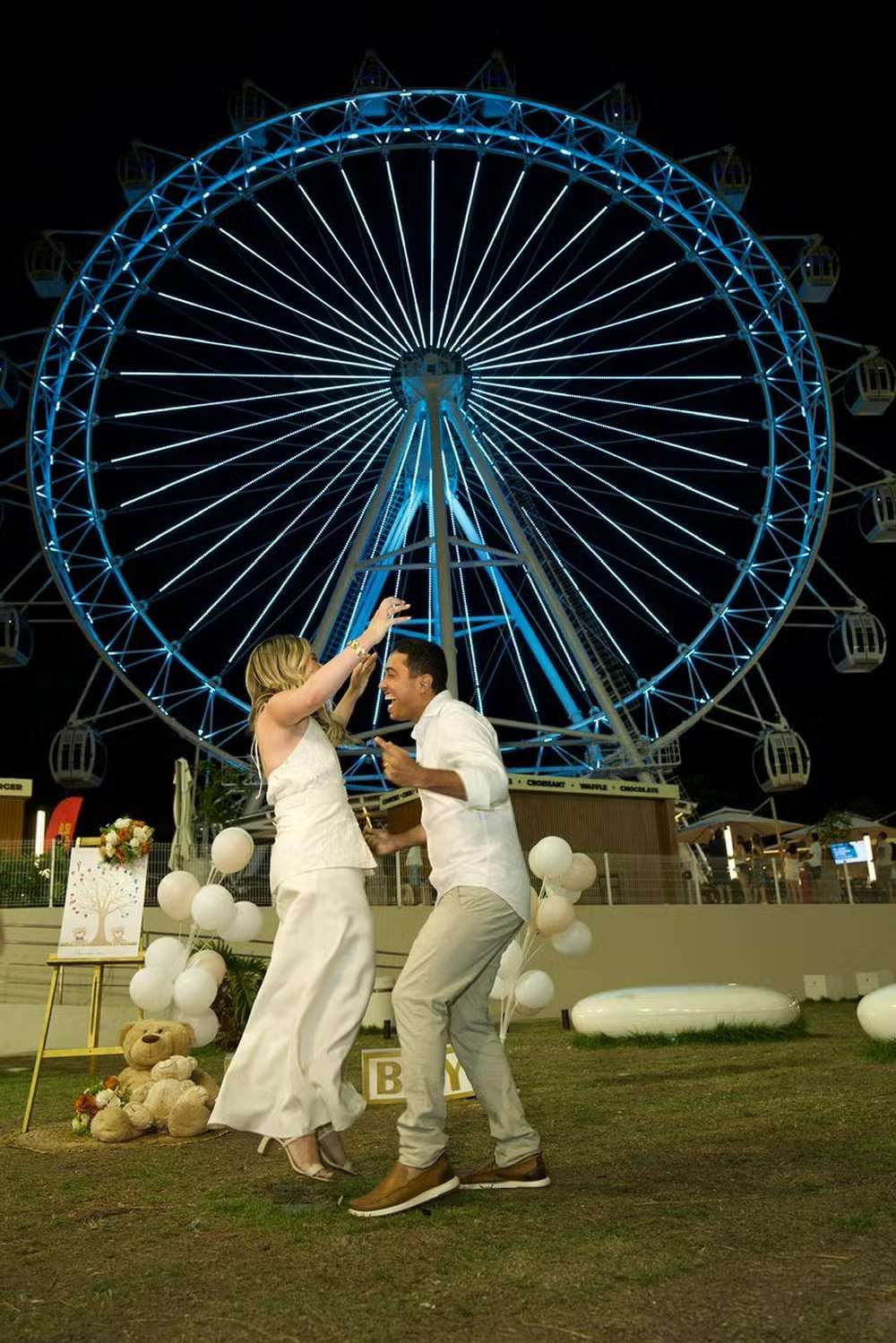 在投影到摩天轮上的倒计时结束后,整座摩天轮被蓝光照亮,揭晓他们迎来一个男孩。整场仪式持续了大约30分钟。这座摩天轮于2025年11月投入运营,作为首场灯光秀的租用者,这对夫妻享受了优惠价格,只需支付1500雷亚尔。正常情况下,其租赁费用在2000雷亚尔至4000雷亚尔之间,具体金额取决于仪式时长。