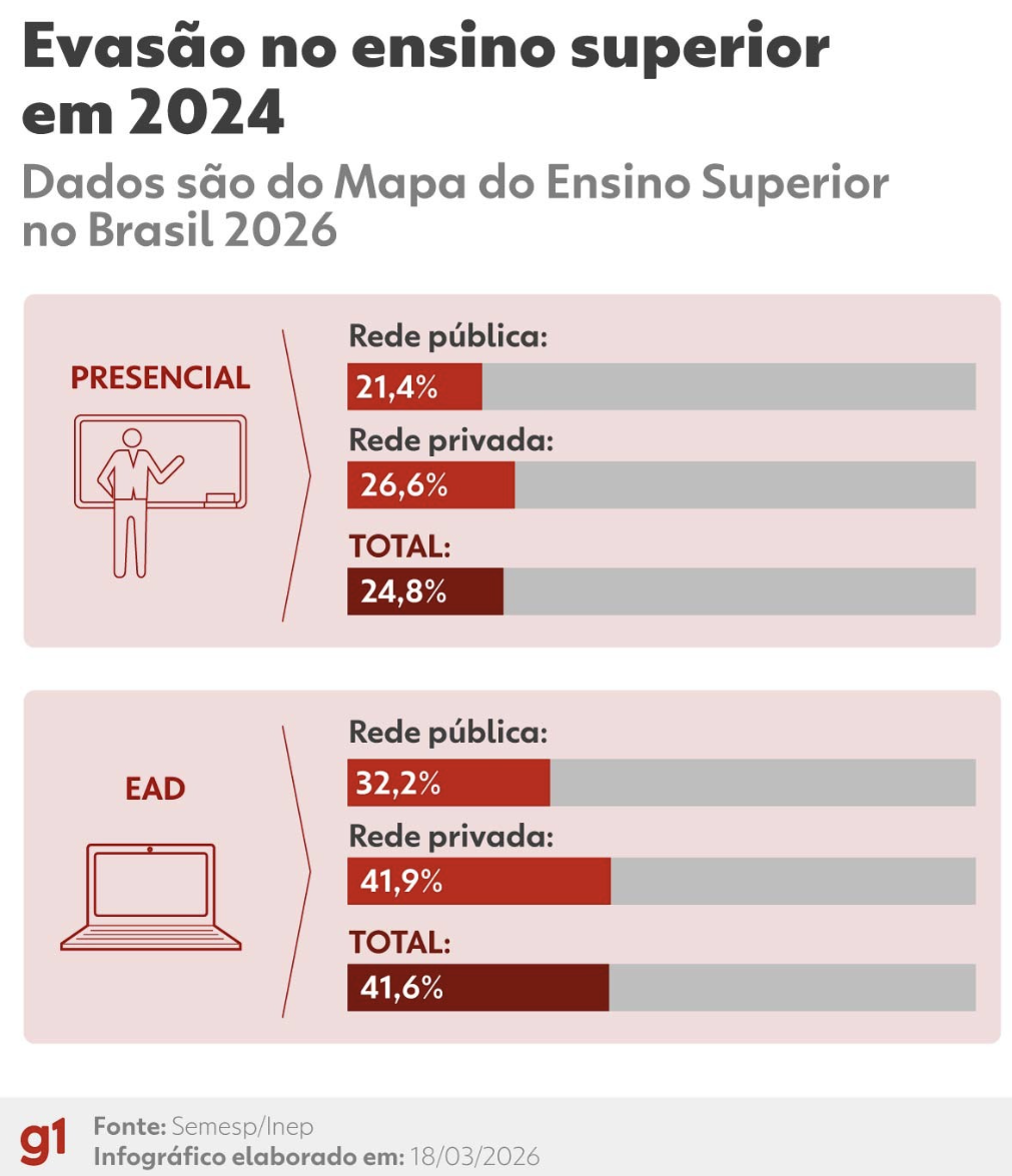 根据代表巴西高等教育维持机构的所做调查,远程教育中的辍学率,主要是由私立系统拉高的,因为该模式中95.9%的注册学生集中在私立院校。2024年,私立远程教育课程的退学率达到41.9%,而公立系统为32.2%。