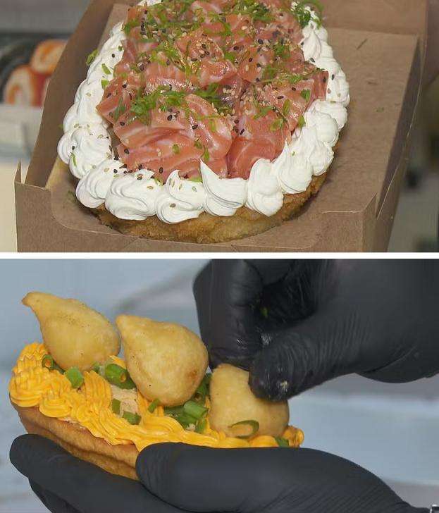 这款美食重量超过1公斤,其外层设计灵感源自日式炸手卷(temaki hot),经高温油炸后的外壳口感十分酥脆。寿司蛋的顶部铺有薄切的新鲜三文鱼片,搭配奶油芝士,再以芝麻和细香葱点缀提味,精致的外观让人赏心悦目。