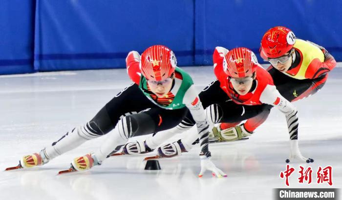 运动员在黑龙江省冰上训练基地短道速滑馆进行速滑测试赛。中新网