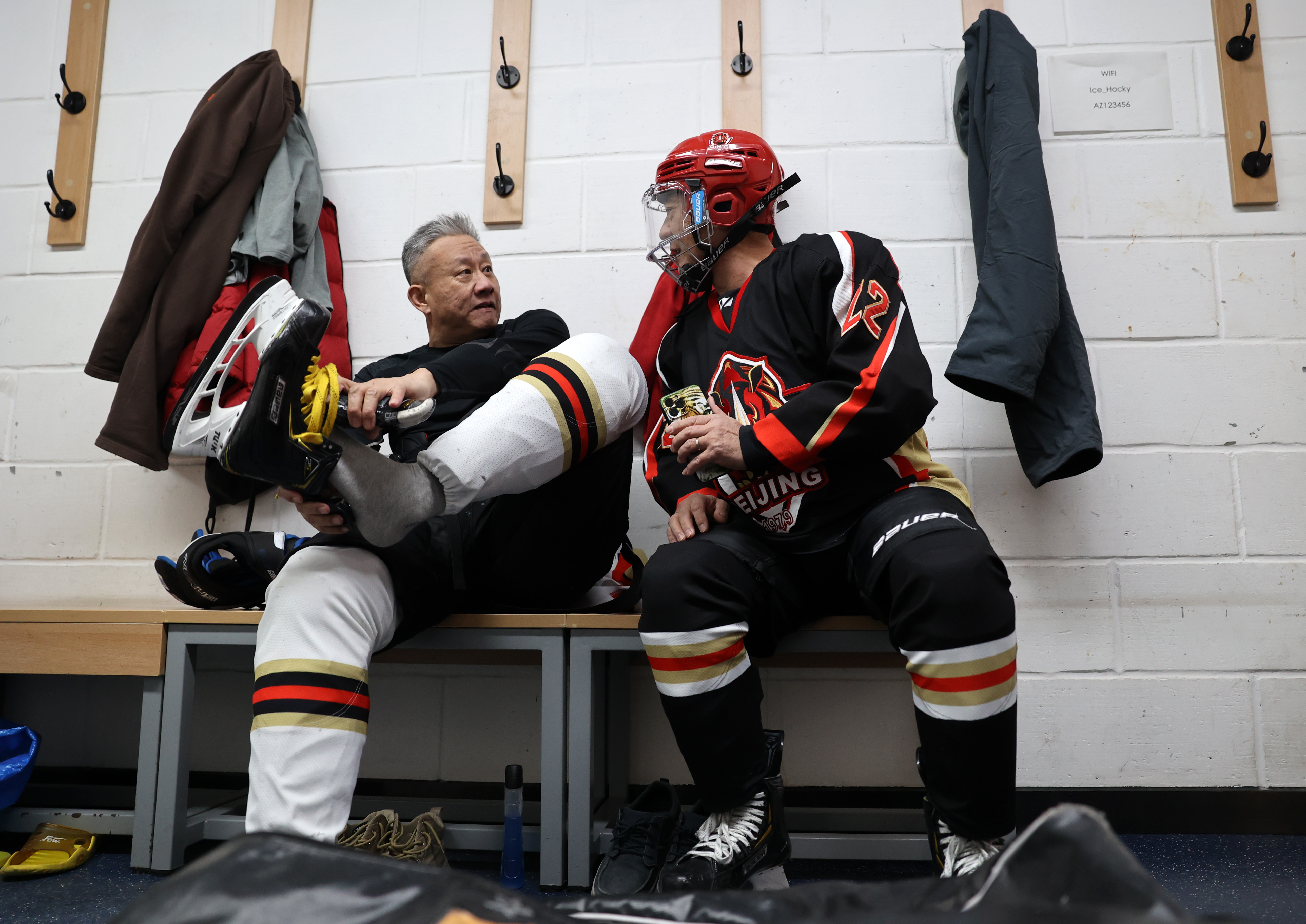 2022年1月5日,“北京1979“冰球队队长梅春晖(左)一边换装备一边与队友聊天。本报特约记者李久骏摄