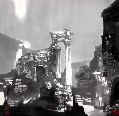 陈辉曾用水墨表现威尼斯水城、罗马老街、瑞士小镇等,在他看来,水墨画是黑白的,自带历史的沧桑感与厚重感,很好地契合了这些西方古建筑的特质;它是多变的,在表现罗马柱的断垣残壁时,可以用一种较悲怆的笔触,而在绘制威尼斯水城时,中国水墨画中水特有的流动性、意韵性及墨分五色的变化,能赋予威尼斯水城一种中国江南小桥流水的感觉,像一首抒情诗。