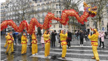 2月6日,法国巴黎香榭丽舍大街新春舞龙舞狮活动举行。中新社