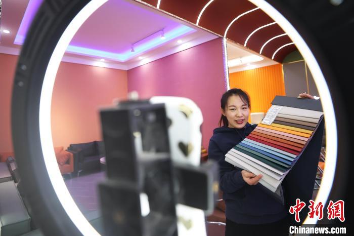 河北省霸州市信安镇工作人员通过网络直播带货。中新网
