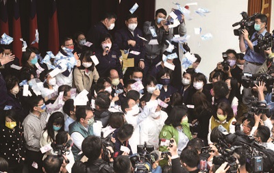 台立法院21日审查攸关“公务机要费”除罪化的法案,当天清晨6时民进党立委与反对该案的国民党立委就在会议室爆发激烈冲突,双方互相推挤抢占主席台。香港中通社