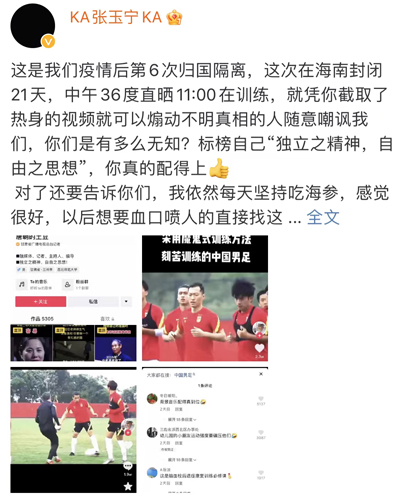 中新体坛微信公众号报道,25日深夜,国脚张玉宁发文回怼自媒体和“喷子”:“这是我们疫情后第6次归国隔离,这次在海南封闭21天,中午36度直晒11:00在训练,就凭你截取了热身的视频就可以煽动不明真相的人随意嘲讽我们,你们是有多么无知?对了还要告诉你们,我依然每天坚持吃海参,感觉很好,以后想要血口喷人的直接找这条微博,我会耐心解答你们对于加强身体对抗的疑惑,也可以面对面与你交流如何增强对抗能力。“