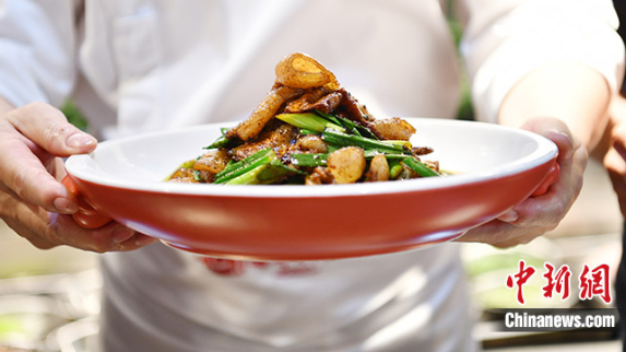 厨师王加强展示自己刚做的川菜回锅肉。中新社