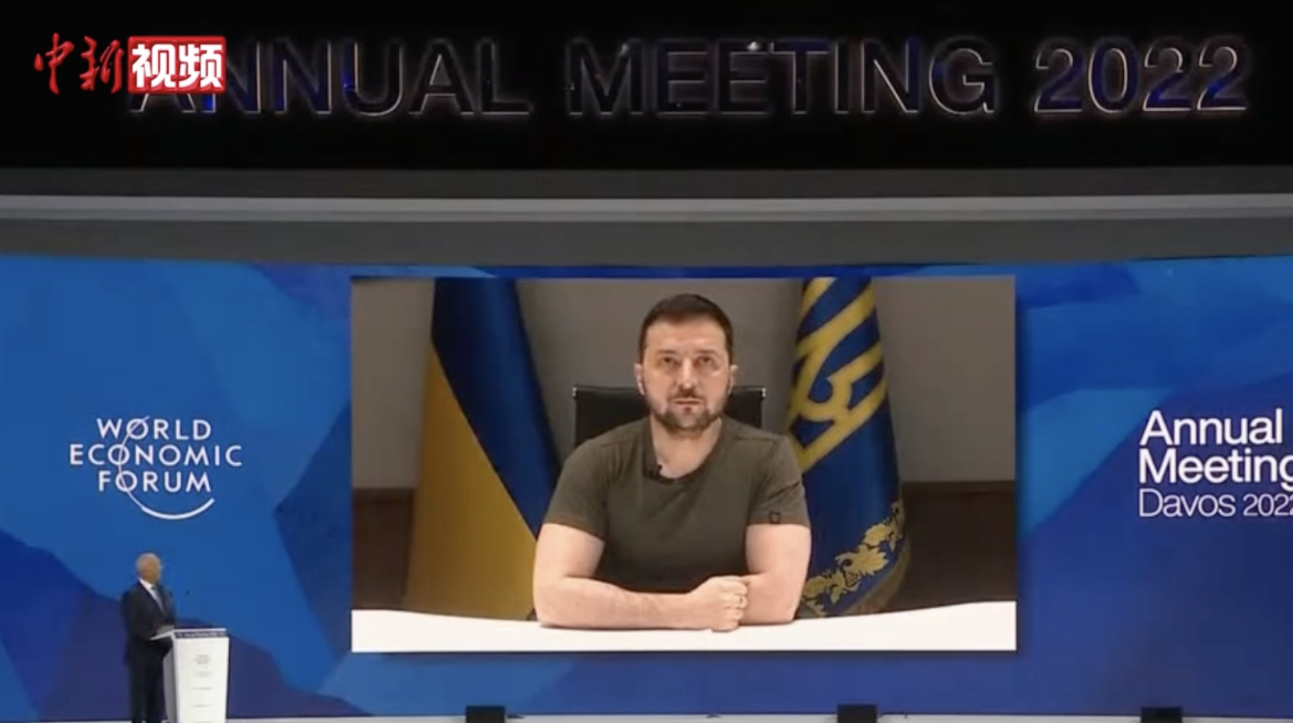 当地时间5月23日,乌克兰总统泽连斯基线上出席了世界经济论坛2022年年会。中新视频