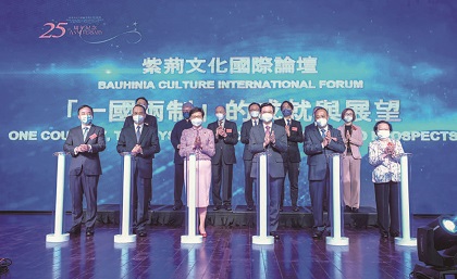 由紫荆文化集团主办的“紫荆文化国际论坛——‘一国两制’的成就与展望”16日在香港举行,香港特区行政长官林郑月娥、香港特区候任行政长官李家超、国务院港澳办副主任黄柳权、外交部驻港公署特派员刘光源等在论坛开幕式上致辞。