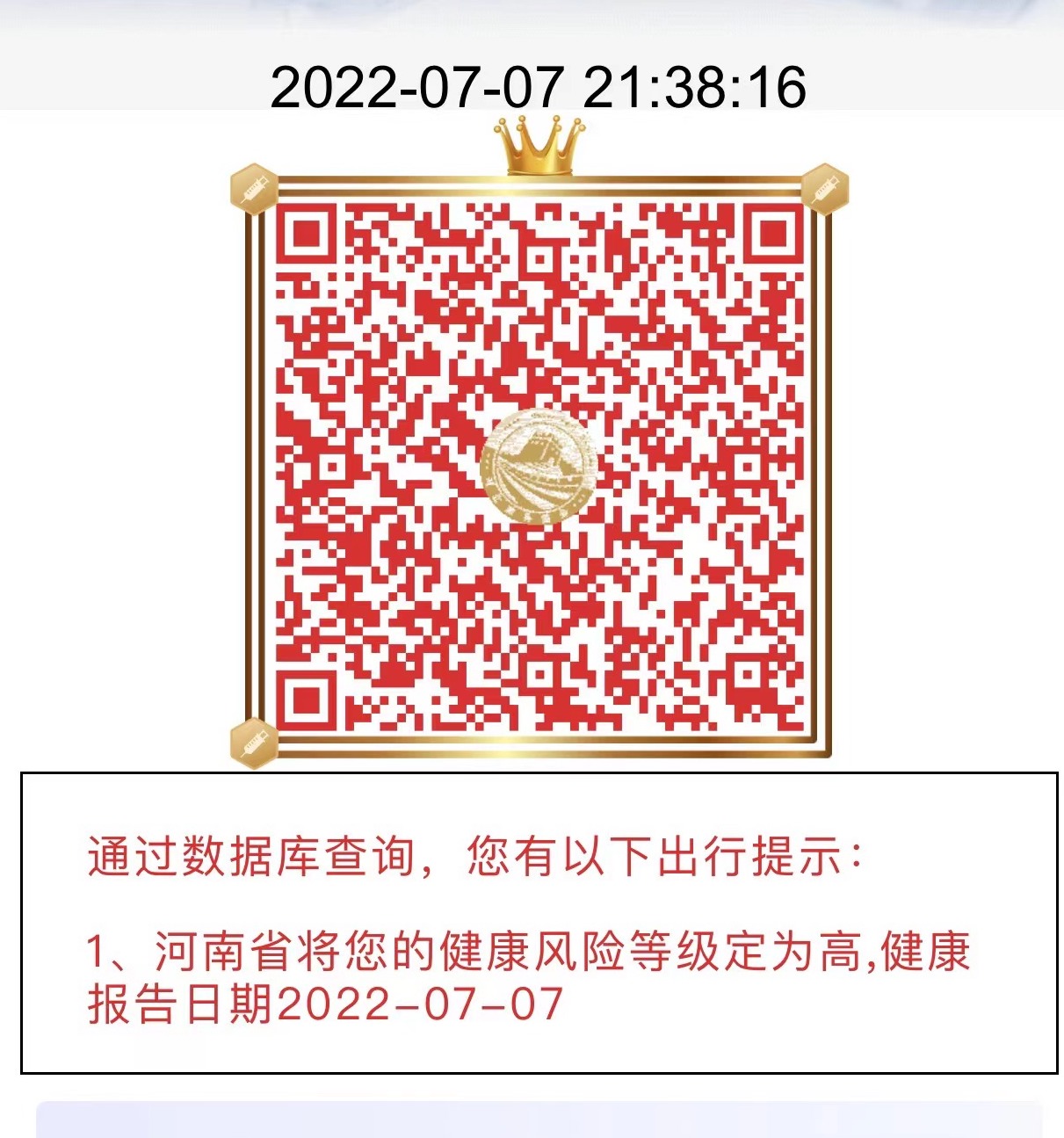 “我自己被赋红码,我老婆不是储户为什么也被赋红码了?”姚先生称,上次赋红码事件时,他和他的妻子均未去郑州,仅扫过群里发出来的郑州场所码就被赋红码,几天之后他们的健康码均转绿。直到7月7日白天,他们的健康码均正常。
