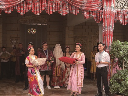 8日,“魅力新疆——海峡两岸记者联合采访活动”来到位于喀什的香妃园,在园区讲解员的热情邀请下,台湾青年体验了维吾尔族传统婚礼的全过程。中新社