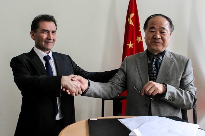 中智文化艺术中心创始人胡安·卡洛斯·拉米雷斯(Juan Carlos Ramírez,左)与中国作家莫言在智利驻华大使馆会面,莫言授权中国-智利文化艺术中心将自己的代表作品之一《生死疲劳》改编成话剧,并在拉美地区演出。智利驻华大使馆