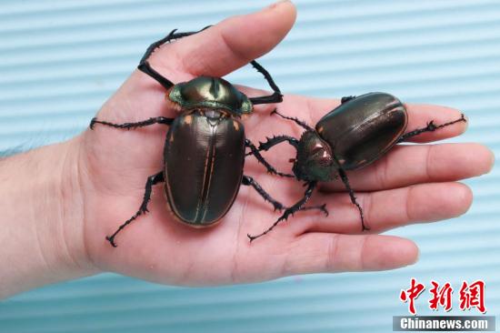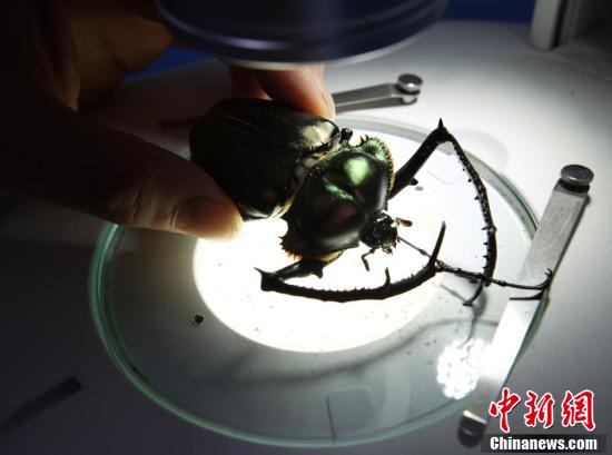 实验室对阳彩臂金龟进行研究。中新社