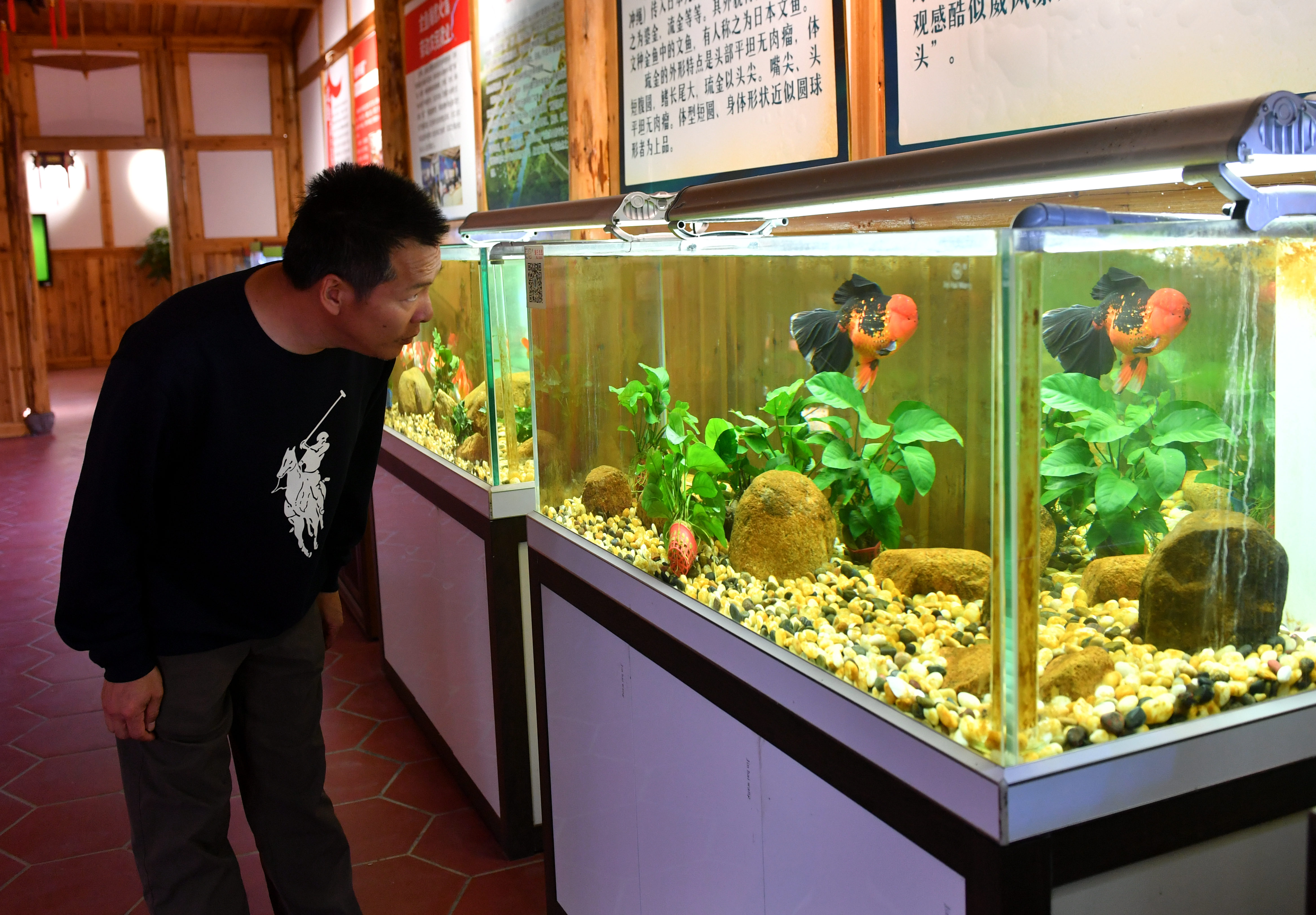 福州市闽侯县荆溪镇关中村的潘氏观赏鱼养殖基地负责人潘国诚在基地展厅察看金鱼情况。中新社