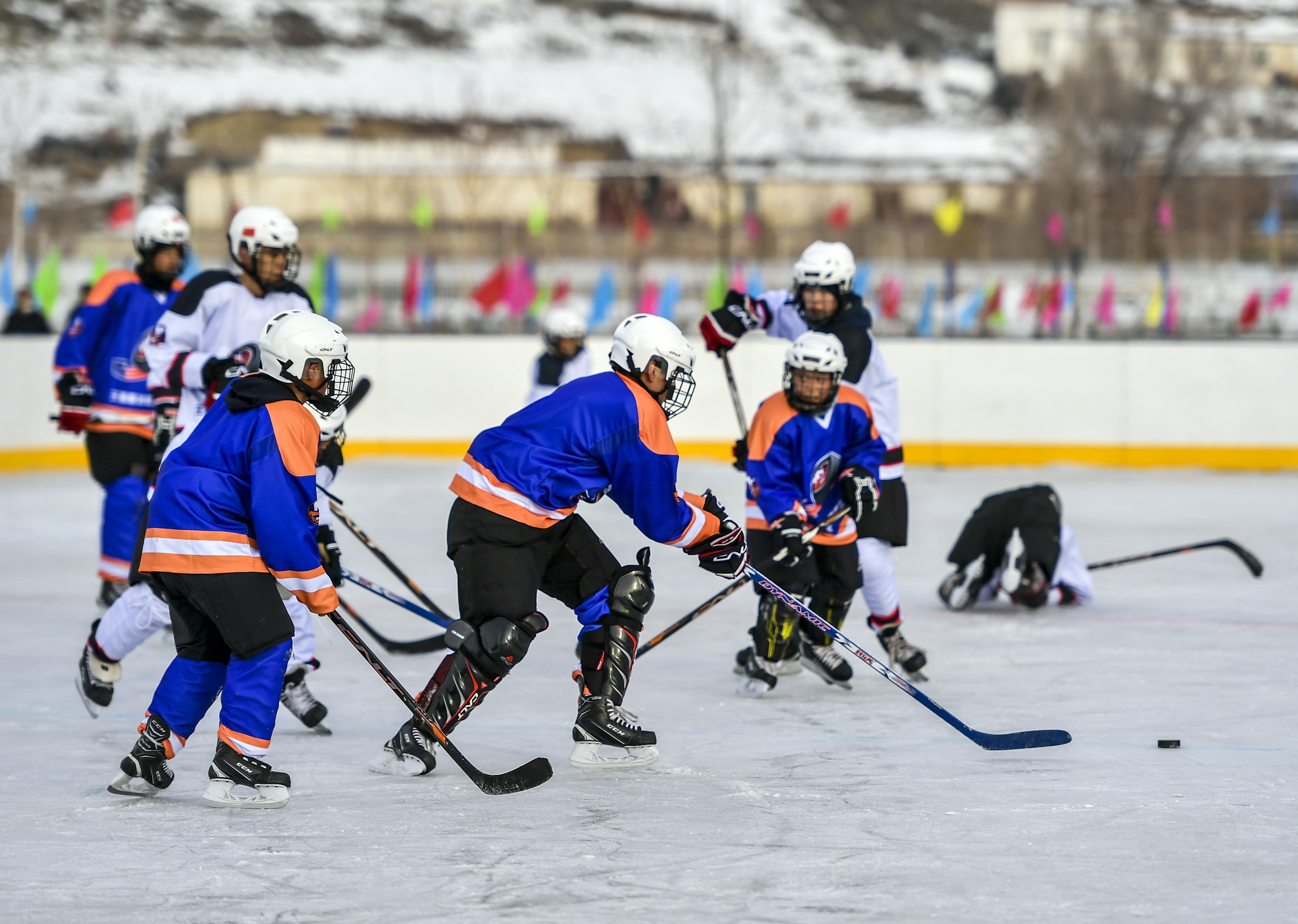 2021年11月26日,新疆阿勒泰地区富蕴县体育馆室外冰场,青少年冰球队展开训练。中新社