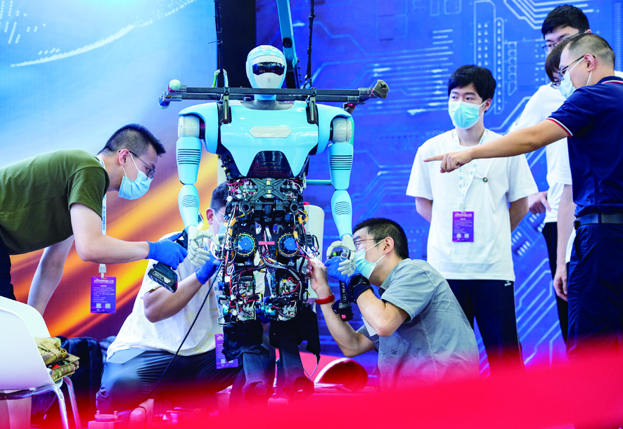 8月18日,2022世界机器人大会环节之一的“2022世界机器人博览会”在北京开启。图为北京理工大学展区内,工作人员正在加紧调试机器人展品。中新社