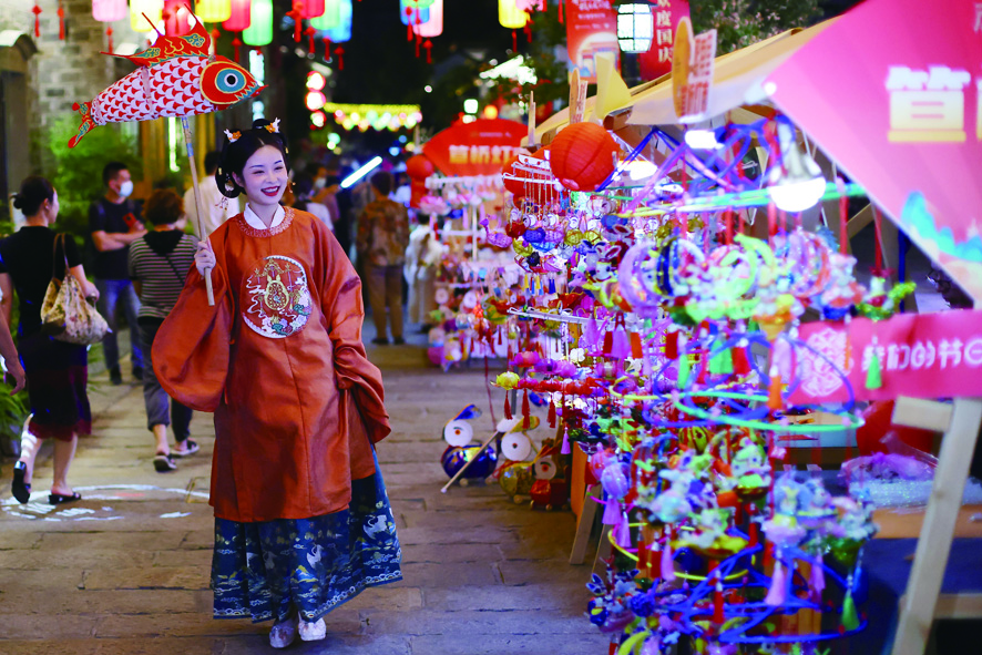 今年中秋假期,逛集市、穿汉服、游园等国潮风盛行。