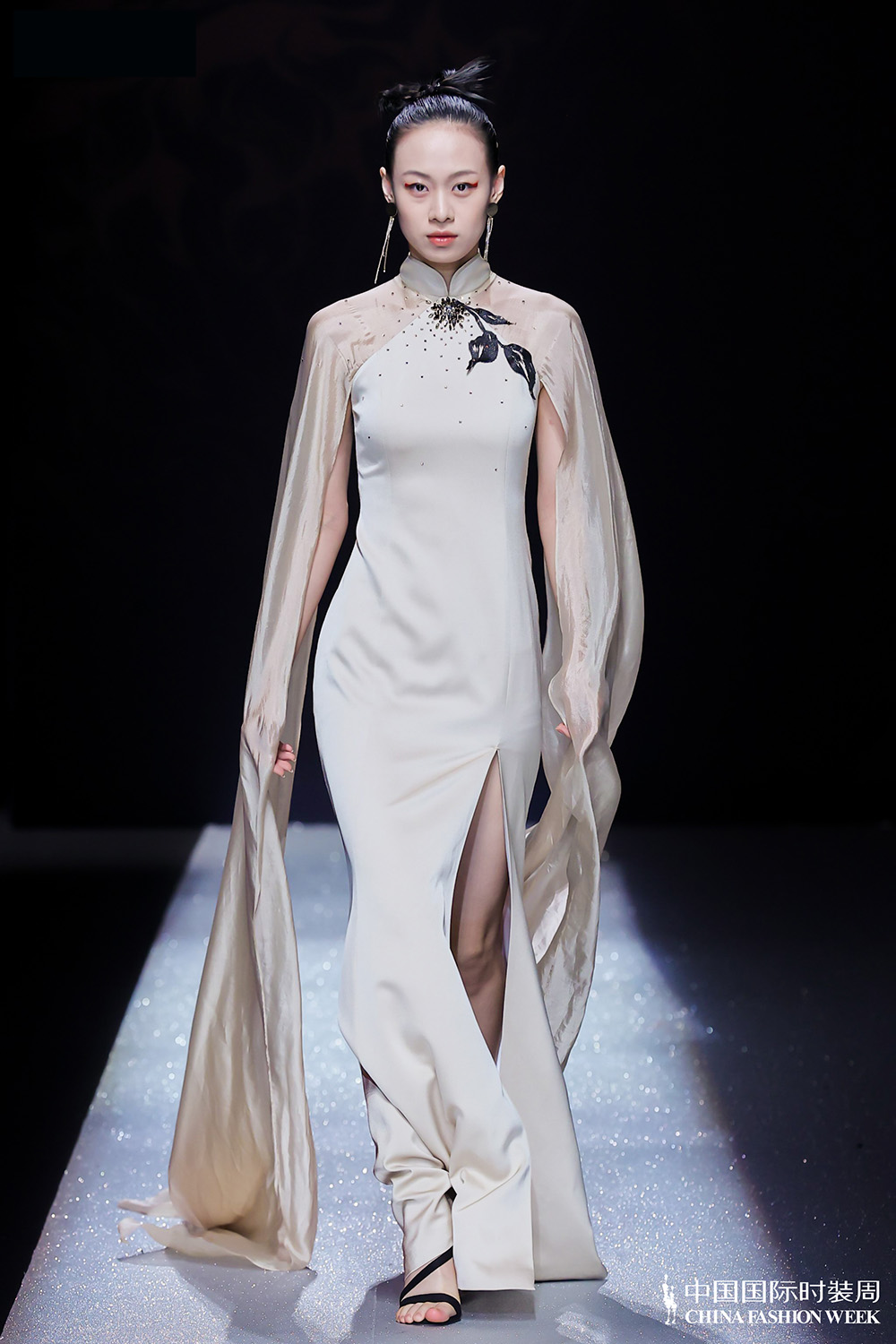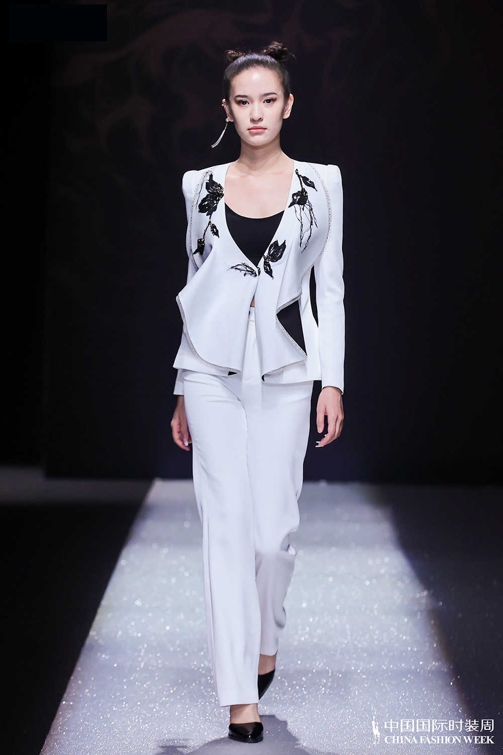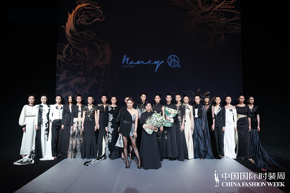 第一章“天”以轻奢成衣为主,第二章“地”主推轻奢小礼服,第三章“情”以重工定制作为本次发布会的亮点,最后压轴三款将重新设计的独创纹样,运用京式渐变刺绣,结合中式传统花扣,同时将蕾丝贴花工艺、法式刺绣工艺和中国传统花扣工艺贯穿整个系列,结合服装的廓形巧妙地装饰于服装结构之中;配色上结合传统色彩理念,以白与黑为主色,配有金色,将传统与现代相融合。中国国际时装周官网