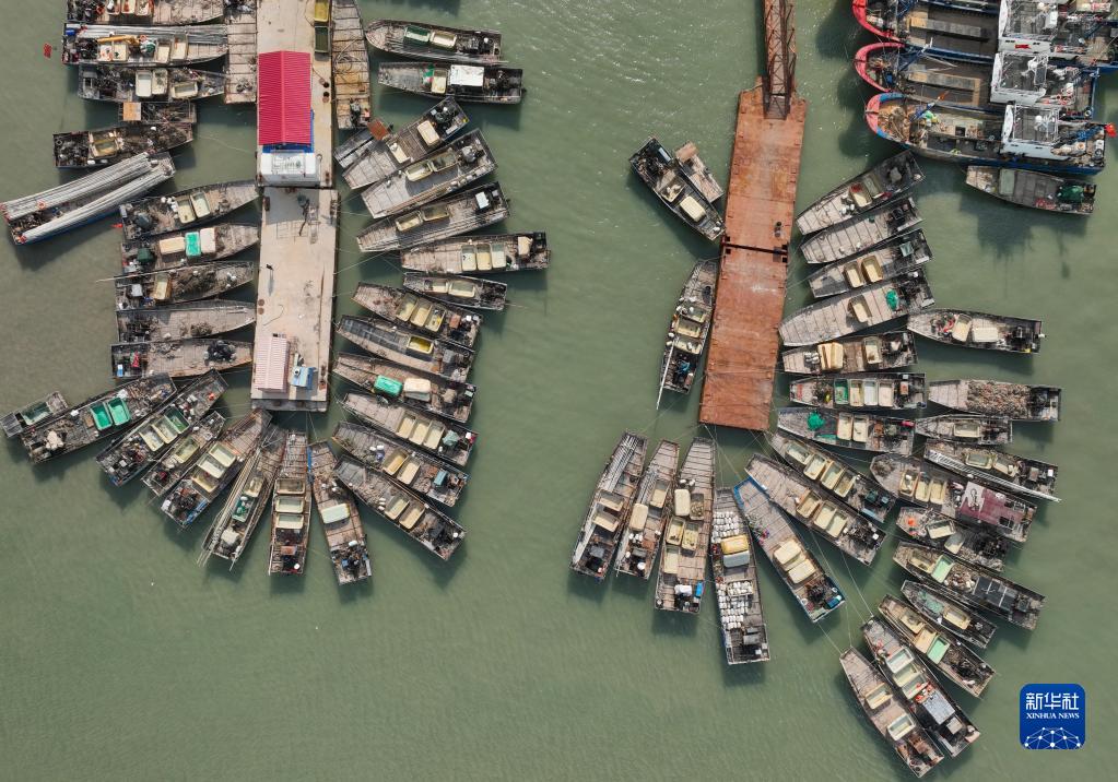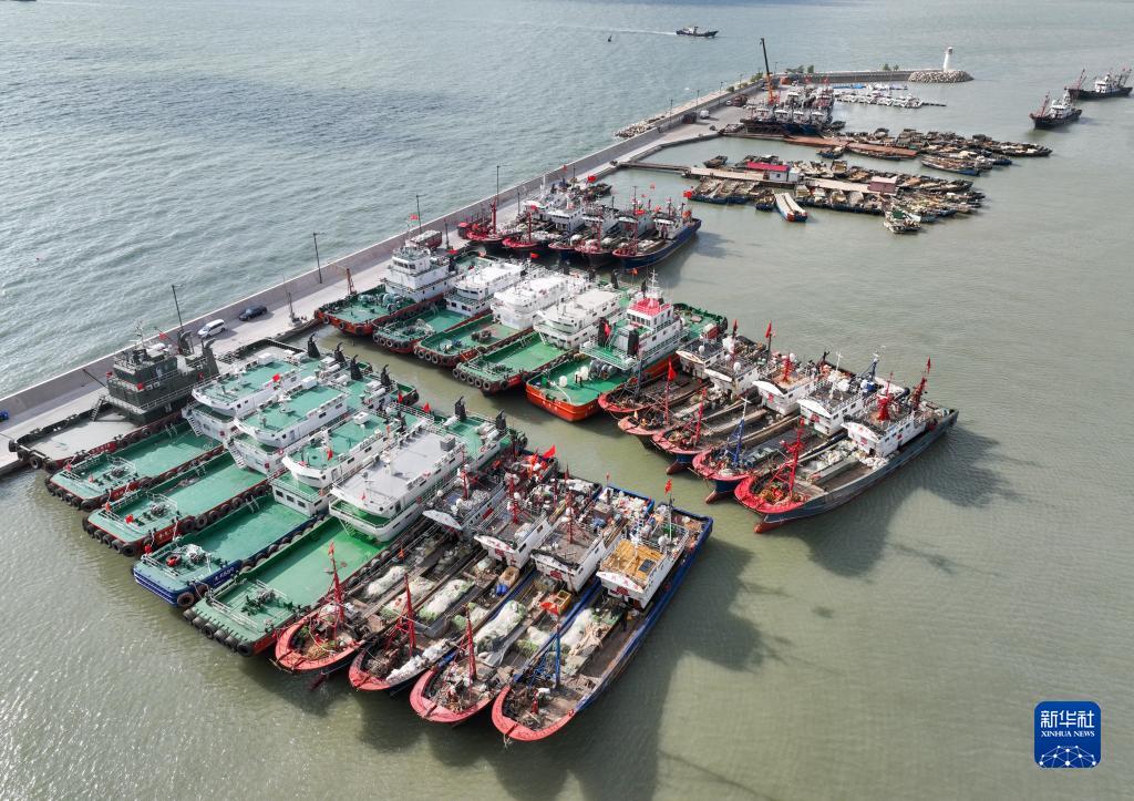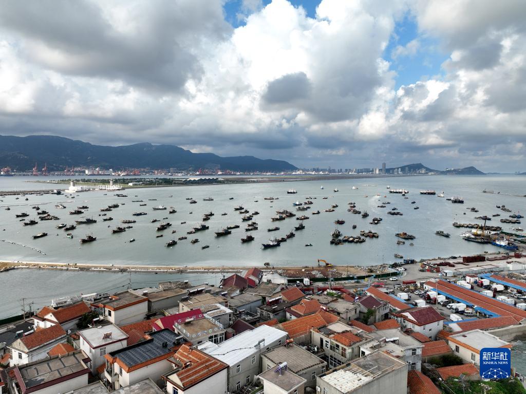 9月13日,渔船停泊在江苏省连云港市连岛中心渔港码头港湾躲避台风(无人机照片)。新华社