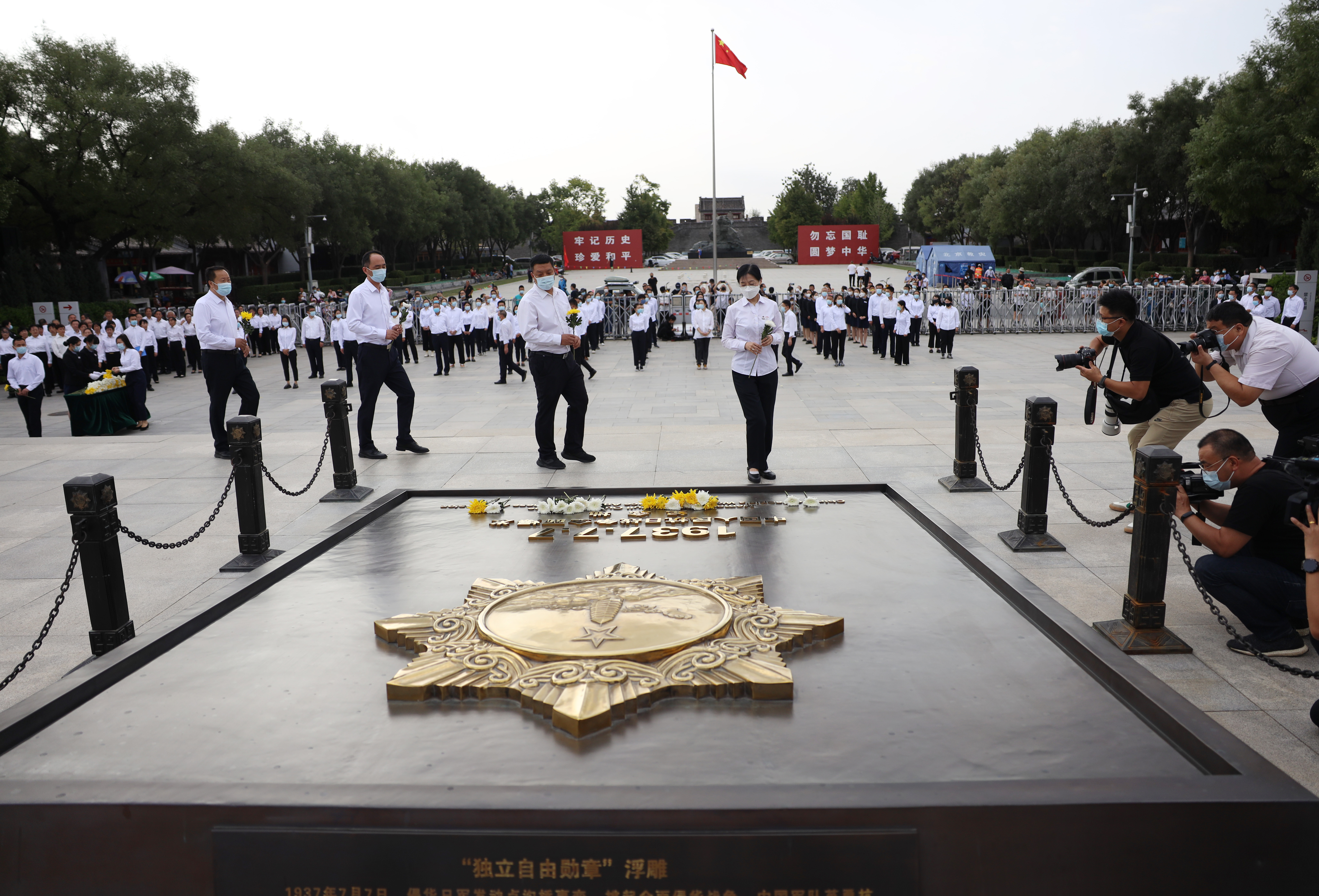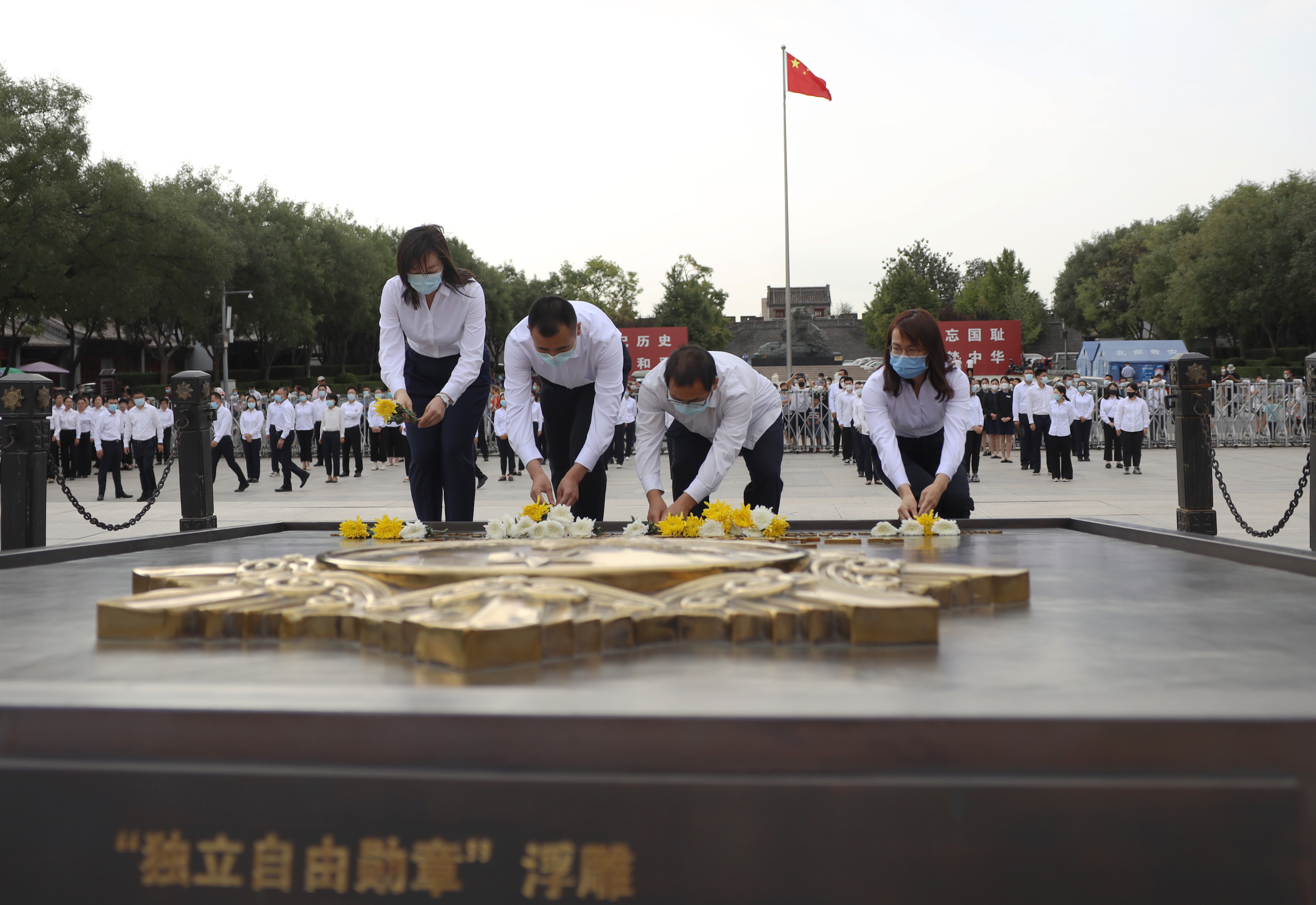 各界民众在北京中国人民抗日战争纪念馆前的独立自由勋章雕塑上敬献鲜花。南美侨报特约记者卞程宣摄