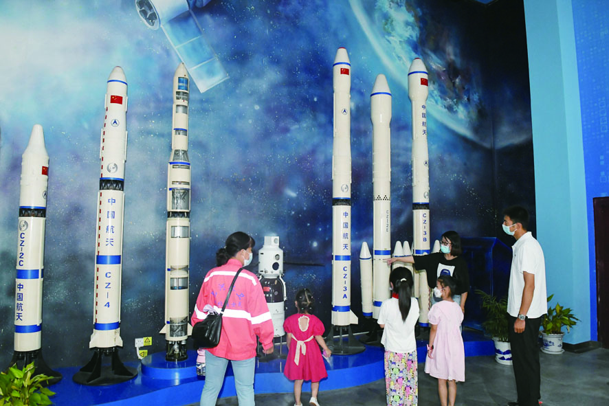 8月13日,小朋友们在安徽省科学技术馆参观航天展区。中新社