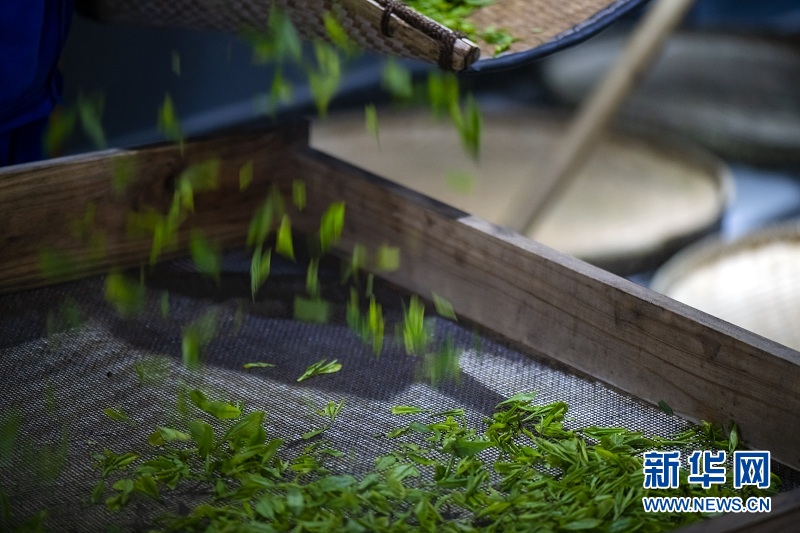 手工恩施玉露制作第一道工艺鲜叶摊放。新华网