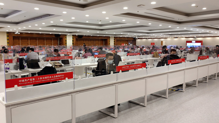 在新闻发布会开始前半小时,中国共产党第二十次全国代表大会新闻中心的记者工作区几乎坐满了中外记者。南美侨报特派记者谭欣 摄