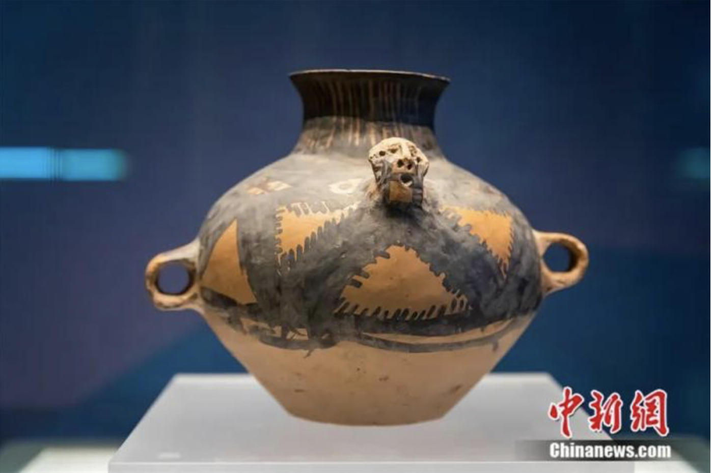 青海省博物馆馆藏马家窑文化马厂类型人头像彩陶壶。中新网