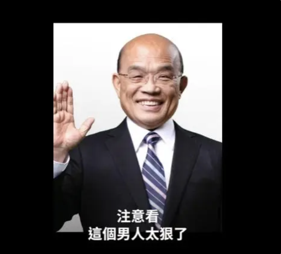 苏贞昌近日发布所谓的“政绩宣传视频”,一开始就用了大陆电影解说常用的开头“注意看,这个男人太狠了”,之后又多次提到“太狠了”3个字,且视频剪辑风格和抖音短视频类似,采用大陆网民常用的计算机语音配音,就连使用的剪辑软件也是抖音旗下的剪映。
