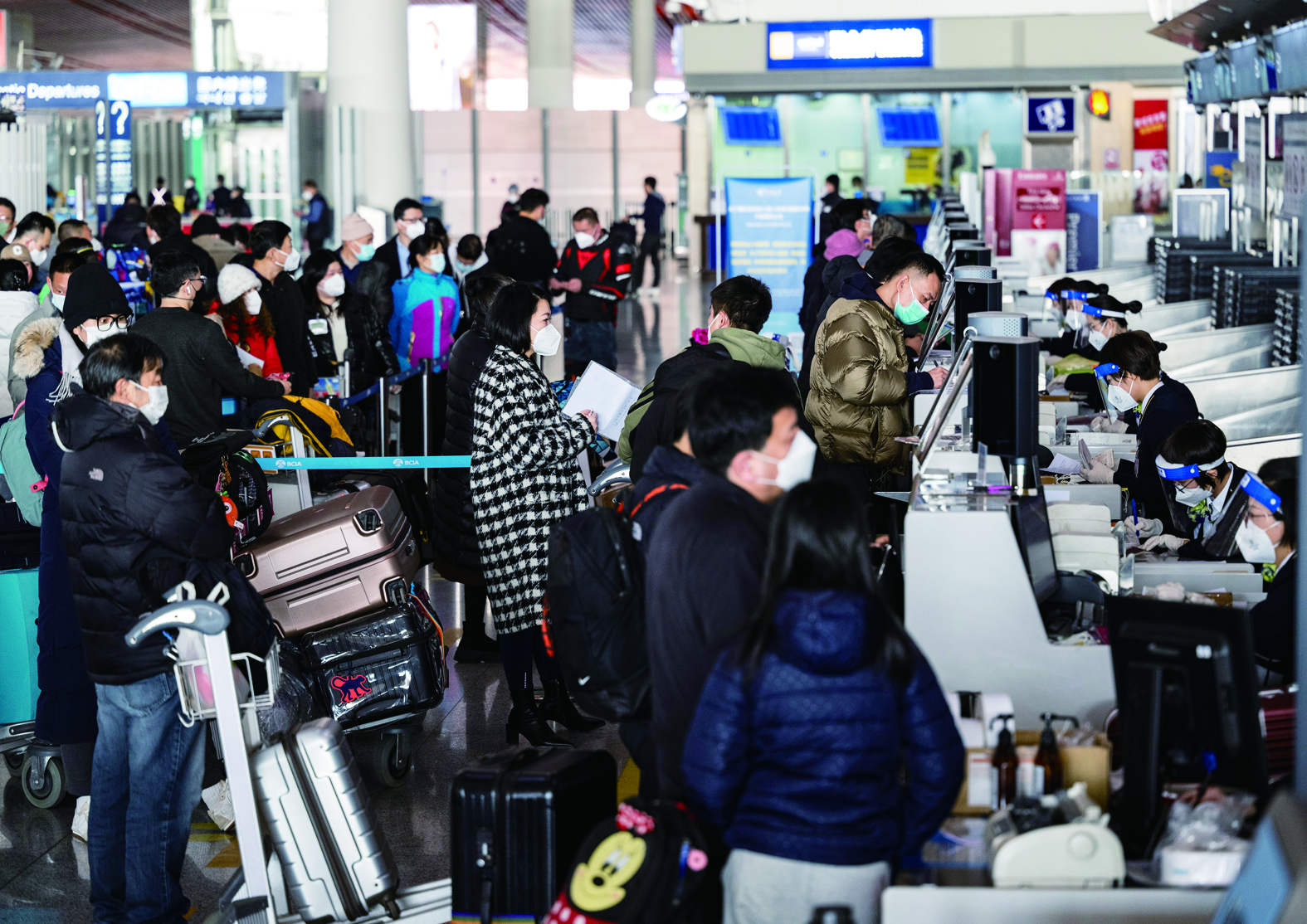 1月8日,旅客在北京首都国际机场T3航站楼日本航空公司的值机柜台排队等待办理登机手续。中新社