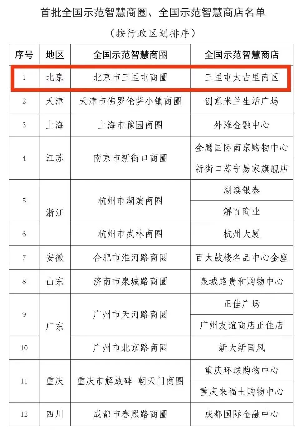 中新经纬报道,中国商务部公布的首批12个全国示范智慧商圈,除北京市三里屯商圈外,还包括天津市佛罗伦萨小镇商圈、上海市豫园商圈、南京市新街口商圈、杭州市湖滨商圈、杭州市武林商圈、合肥市淮河路商圈、济南市泉城路商圈、广州市天河路商圈、广州市北京路商圈、重庆市解放碑-朝天门商圈和成都市春熙路商圈。