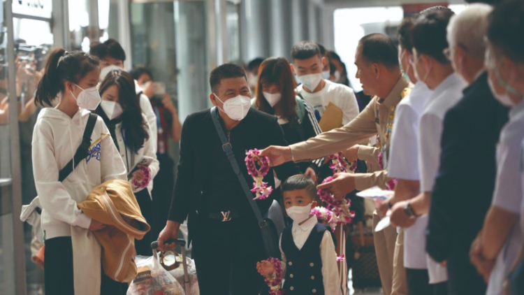 ▲9日,泰国官员在位于首都曼谷东郊沙没巴干府的素万那普机场欢迎中国旅客。新华网