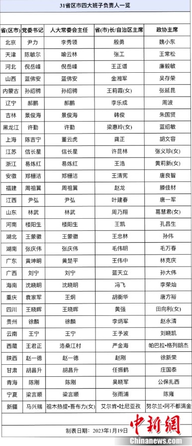 北京市、江苏省、甘肃省、青海省近日完成两会议程,至此,中国31个省、市、自治区省级人大常委会、政府、政协三套班子的换届工作已全部完成,共有39位正部级干部履新。
